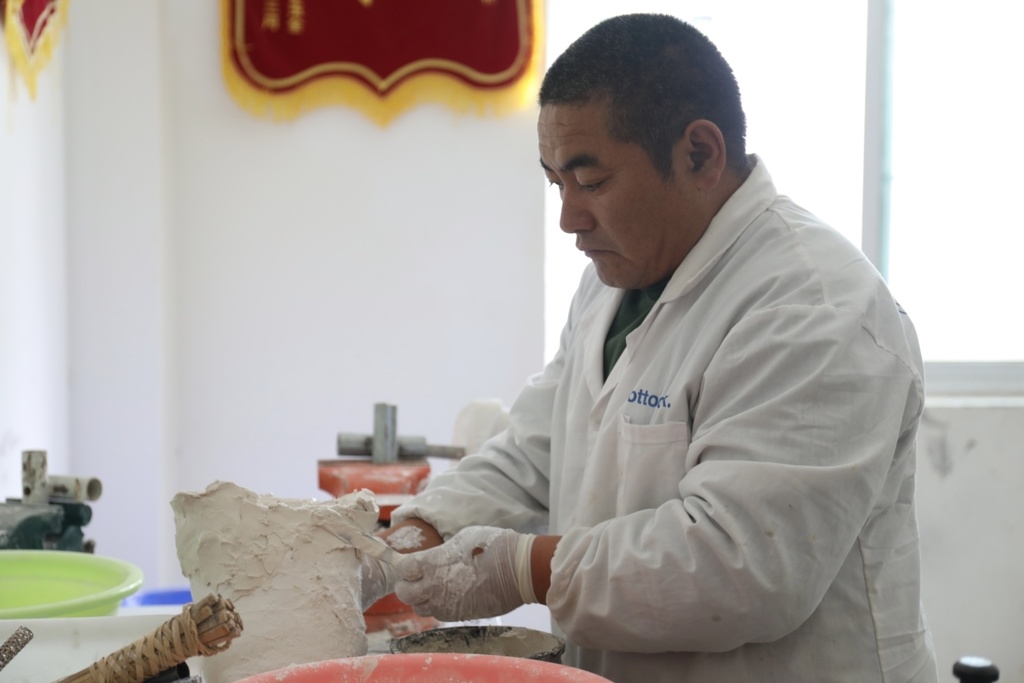 阿坝州残疾人康复中心假肢站内,假肢制作工程师杨光才在制作假肢模型。周琳摄