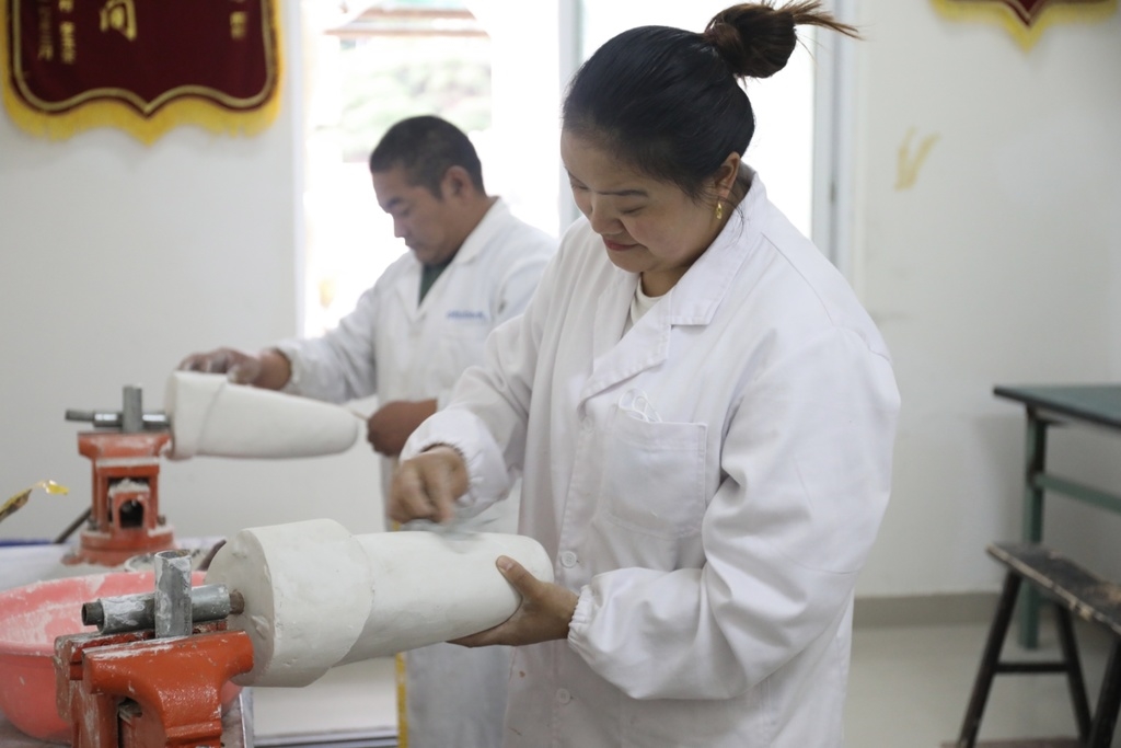 阿坝州残疾人康复中心假肢站内,假肢制作工程师杨光才(左)带着徒弟陈艳(右),在制作假肢模型。周琳摄