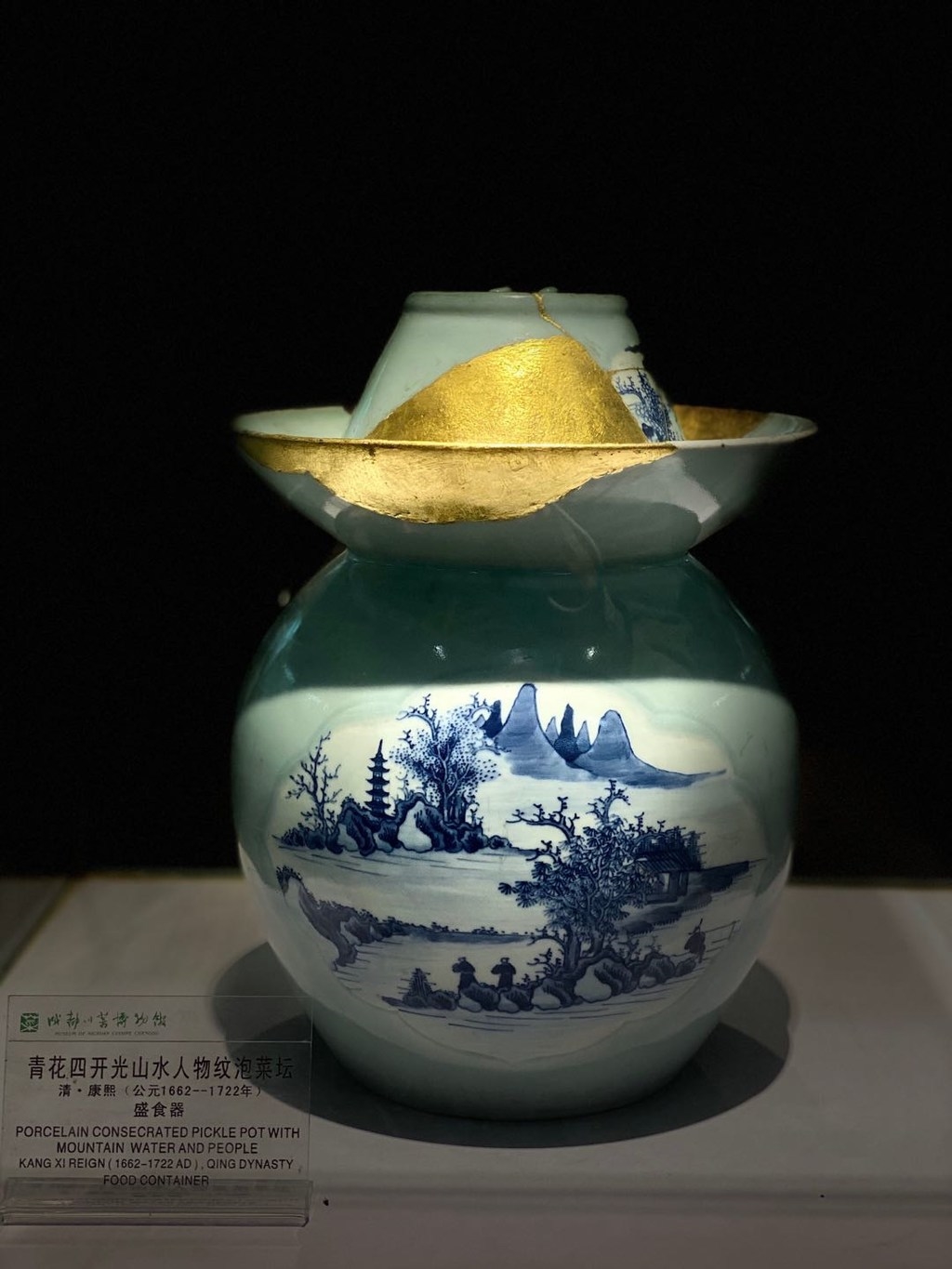 清代康熙年间的“青花四开光山水人物纹泡菜坛”(成都川菜博物馆供图)