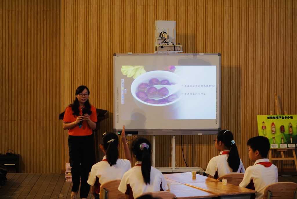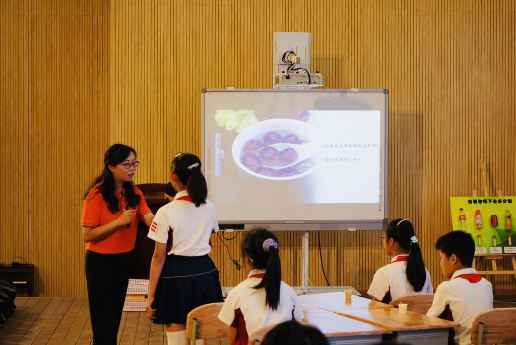 如何摄盐讲完后,王瑶为孩子们讲起如何控糖。“某品牌凉茶,糖27.6克;某品牌盒装橙汁,糖24.5克;某品牌冰糖雪梨,糖55克......"在科普大讲堂上,王瑶向孩子们展示了部分知名饮料的检测数值,建议孩子们要减少添加糖摄入,每人每天不超过50克,最好少于25克。