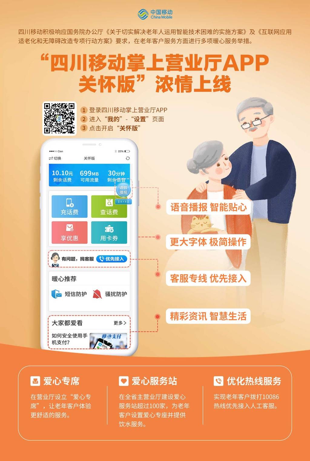 此前,四川移动就推出了一系列方便老年人的服务。其中,线下营业厅开辟老年人专属服务通道,进厅老年人可享受“爱心服务台席”的一对一温馨服务;设置老年人爱心专座,配备老花镜、轮椅等助老便民设备,发放“银发服务”手册,推荐老人专属“孝心卡”“孝心包”优惠活动;提供“手机辅导员”服务,为中老年客户提供智能手机基本操作和常用APP使用等免费帮助。