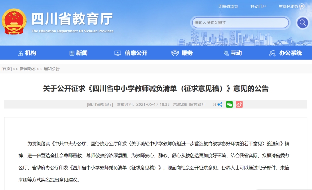 四川在线记者5月18日从四川省教育厅获悉,为进一步营造全社会尊师重教、尊师敬教的浓厚氛围,为教师安心、静心、舒心从教创造更加良好环境,结合我省实际,教育厅拟报请省委办公厅、省政府办公厅印发《四川省中小学教师减负清单(征求意见稿)》,现面向社会公开征求意见。具体如下: