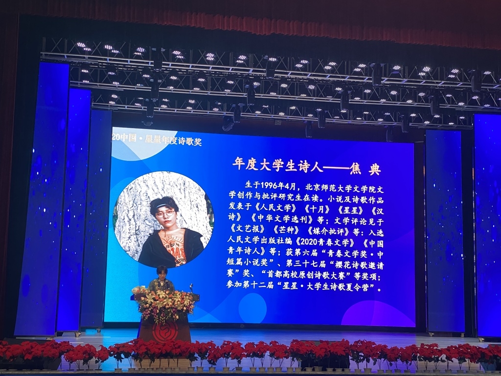 5月18日,由《星星》诗刊社、成都文理学院主办的“2020中国·星星年度诗歌奖”颁奖典礼在成都文理学院举行。张烨、耿占春、焦典分别摘取2020年度诗人奖、年度评论家奖、年度大学生诗人奖。