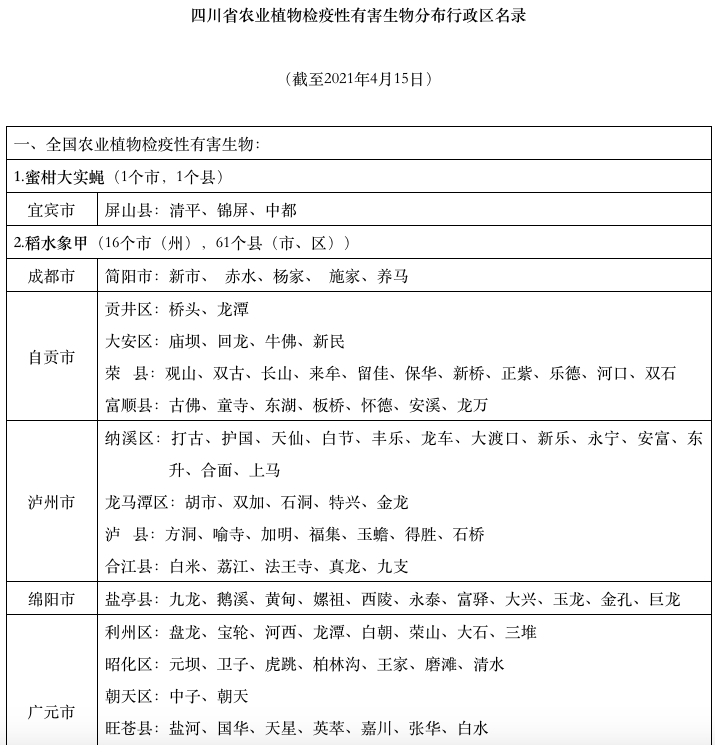 5月18日,记者从四川省农业农村厅获悉,近日,该厅公布了《四川省农业植物检疫性有害生物分布行政区名录》,涉及11种有害生物。