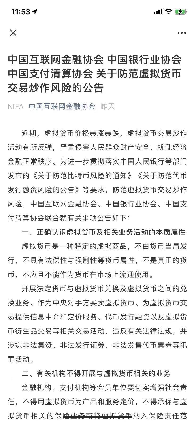 5月18日晚间,中国互联网金融协会、中国银行业协会、中国支付清算协会联合发布关于防范虚拟货币交易炒作风险的公告。公告表示,开展法定货币与虚拟货币兑换及虚拟货币之间的兑换业务、作为中央对手方买卖虚拟货币、为虚拟货币交易提供信息中介和定价服务、代币发行融资以及虚拟货币衍生品交易等相关交易活动,违反有关法律法规,并涉嫌非法集资、非法发行证券、非法发售代币票券等犯罪活动。