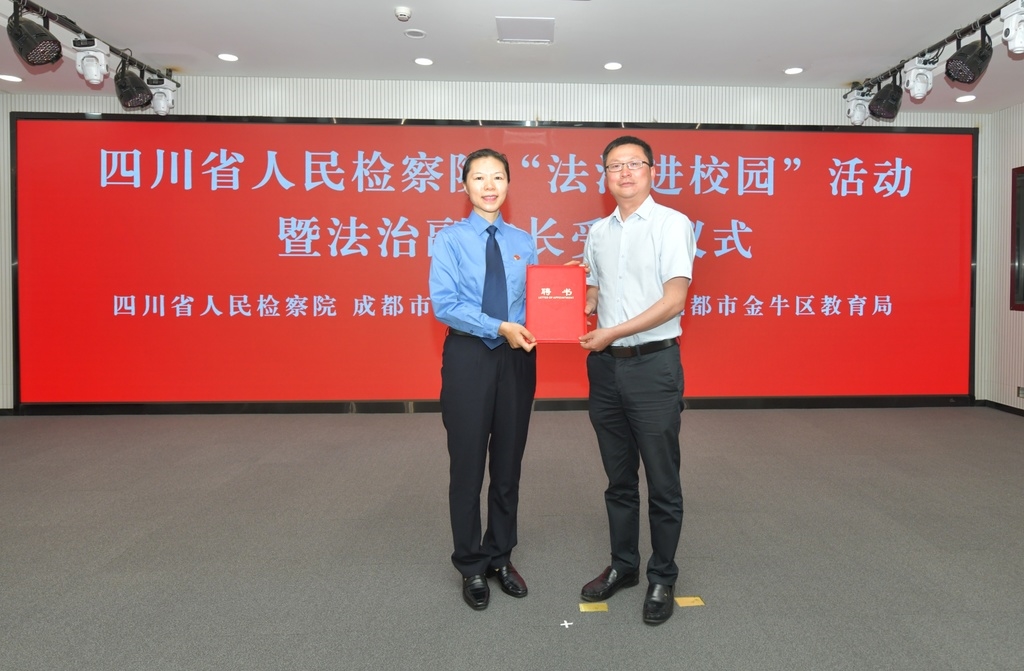 5月19日,四川省人民检察院“法治进校园”活动暨法治副校长受聘仪式在成都市金牛区人民检察院举行,金牛区教育局为省检察院党组成员、驻院纪检监察组组长蒋敏,检察委员会专职委员立克幸义等五位检察官颁发法治副校长聘任证书。