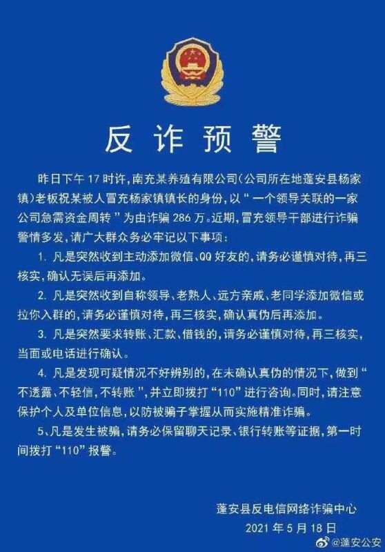 5月17日下午5时许,南充某养殖有限公司(公司所在地蓬安县杨家镇)老板祝某被人冒充杨家镇镇长的身份,以“一个领导关联的一家公司急需资金周转”为由诈骗286万元。