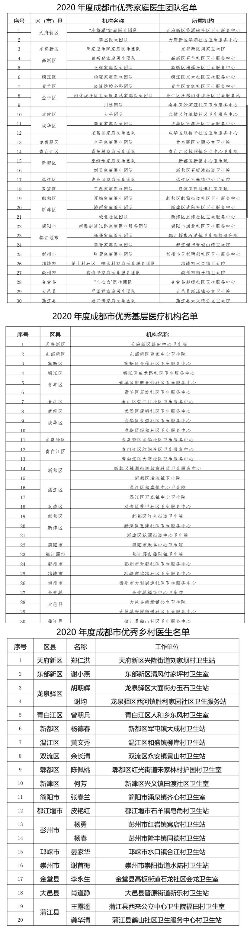 为进一步宣传家庭医生签约服务,大力打造家庭医生服务品牌,宣传先进典型,增强职业荣誉感,在全社会形成尊重、信任和支持家庭医生的浓厚氛围,成都市卫健委联合相关单位,评选出20名“优秀乡村医生”、30个“优秀基层医疗机构”以及30支“优秀家庭医生团队”,现场宣读了获奖名单。