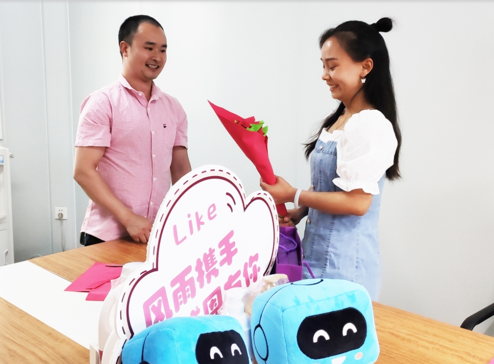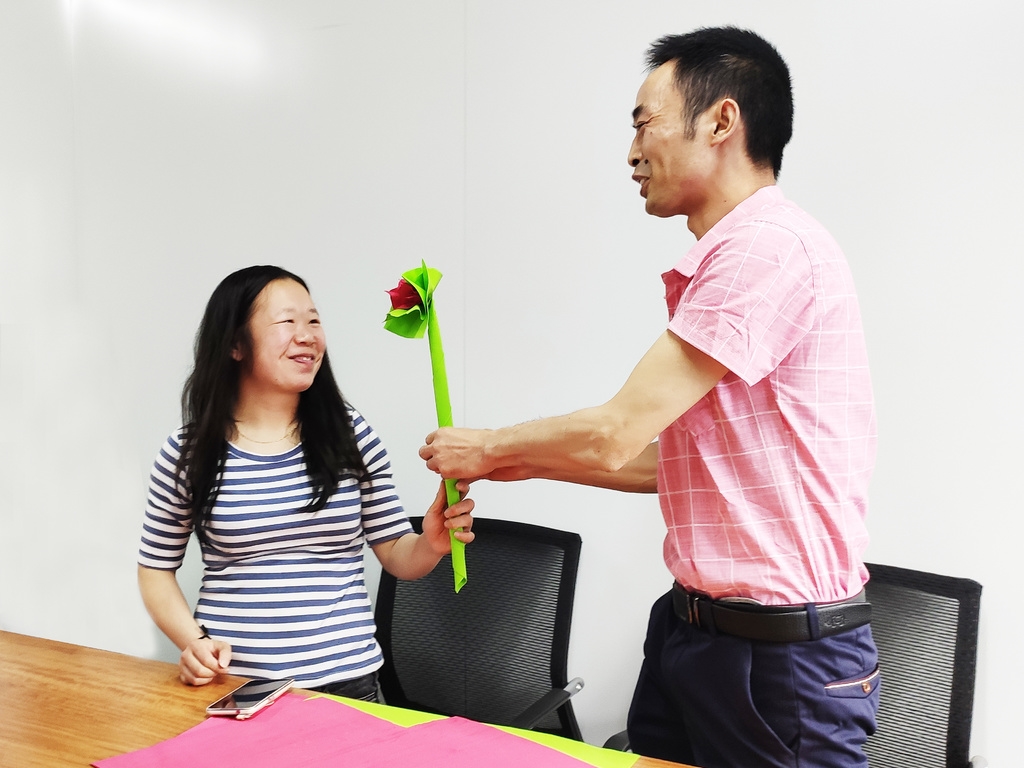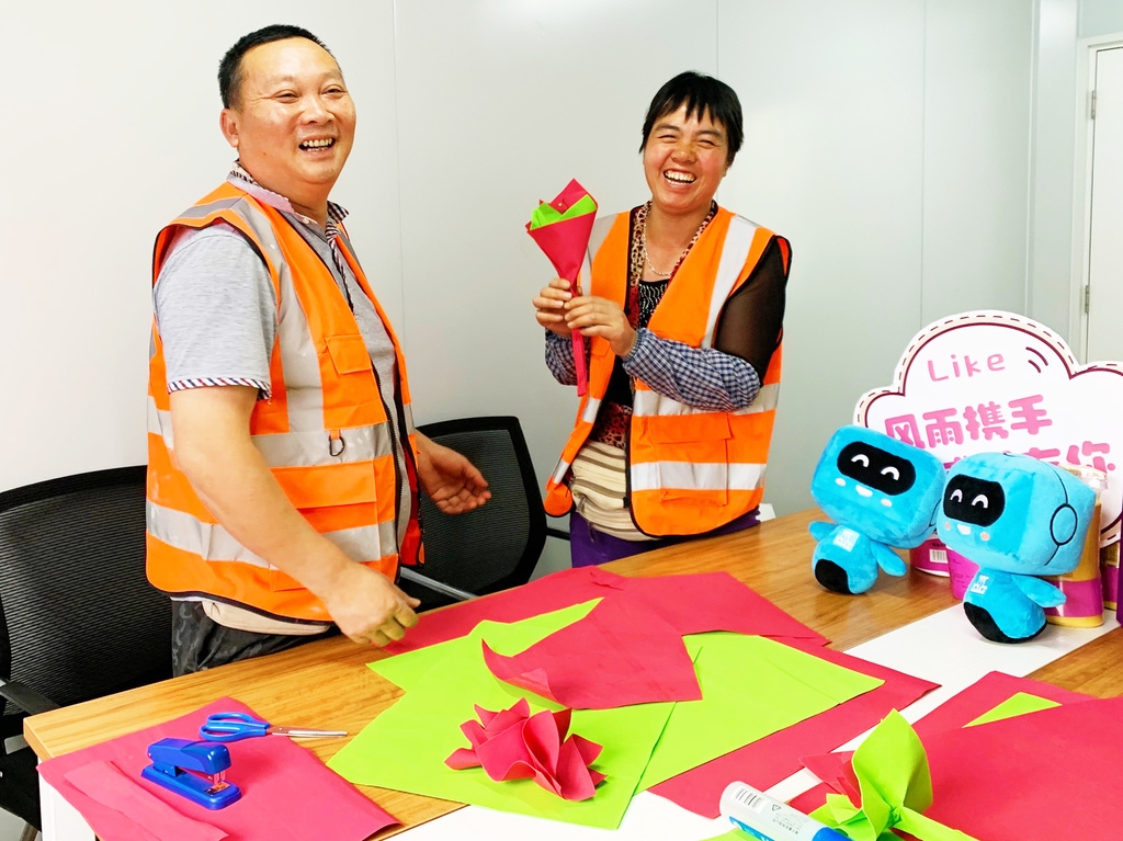 志愿者们立即在项目上找来折纸和工具,帮助杨政委一起,教他制作手工折花。不一会,一朵虽不精美但是饱含感情的折花慢慢呈现出来。杨政委在志愿者的鼓励下,将花送给了自己的妻子:“老婆,有你在的地方就是家,你辛苦了。”