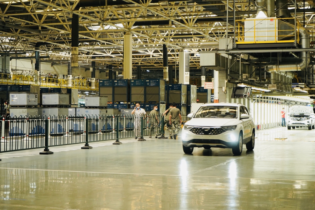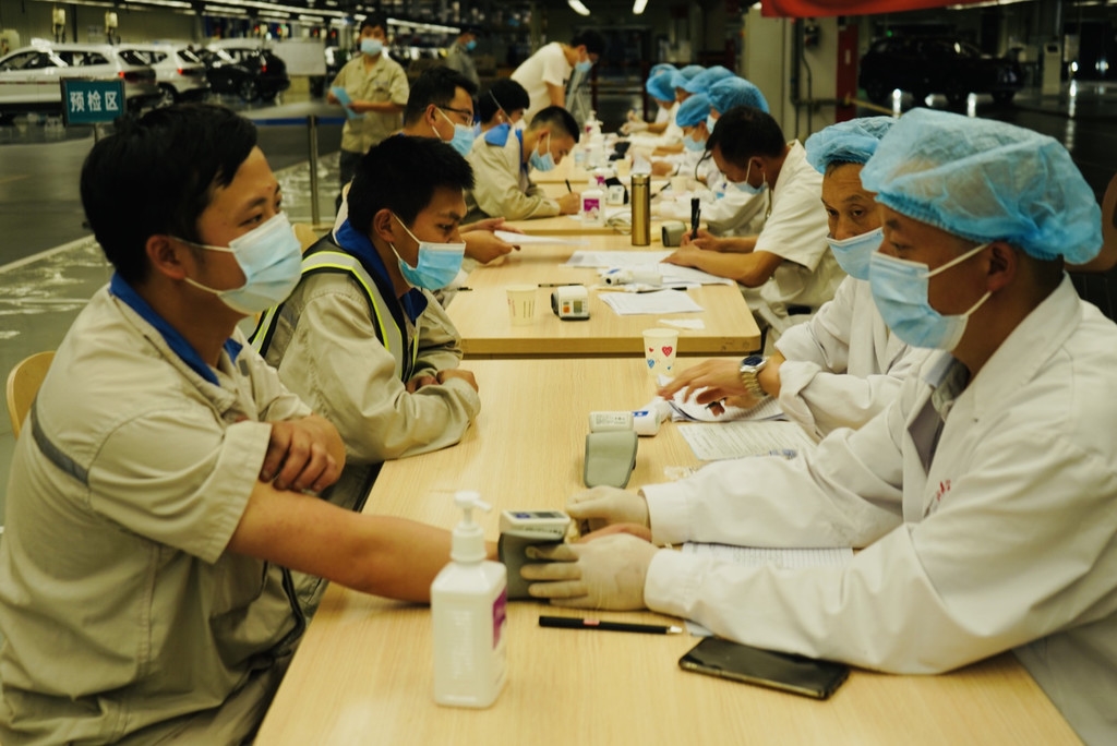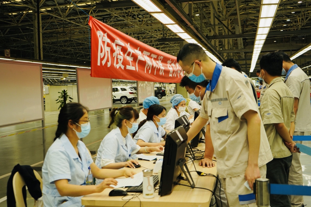 一汽-大众成都分公司内,工作人员正在有序预检。刘萌 摄