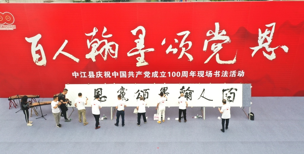 活动现场,7位中江籍书法家现场挥毫,创作10米长卷“百人翰墨颂党恩”活动主题书法作品,由全县各级党员干部、群众、书法爱好者组成的百人方阵,同时书写“百人翰墨颂党恩”七个大字,共同用笔墨向党的100周年华诞献礼。