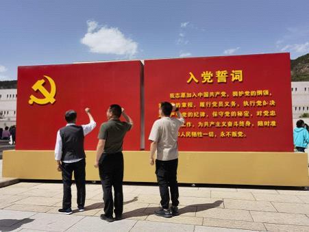 延安革命纪念馆前矗立着高耸威严的毛泽东塑像,周围布置着“庆祝中国共产党成立100周年”、“入党誓词”、“党旗”等庆祝活动展板。祖父一看到入党誓词就两眼放光,挪不动步。在党旗下,庄严肃穆地缓缓举起右手,握成拳头,带领着父亲和我又一次宣誓,引得路人纷纷围观,进行效仿。祖父的普通话不算标准,甚至这是我印象中第一次听见他说普通话,但跟随着他一字一顿、铿锵有力的嗓音,我仿佛穿越了时空,走过了伟大的长征路,走到了伟大的延安,走向了胜利的西柏坡,走向了解放的全中国。在那一瞬间我忽然明白,“只要还有一口气,爬也爬到延安城”,伟大的延安精神是那个年代黑暗中升起的启明星,为希冀打破被压迫被奴役命运的人民指引前进方向,是进步青年寄托远大志向的炼钢炉,更是广大群众选择、相信、追随、依靠我们党的真实写照。