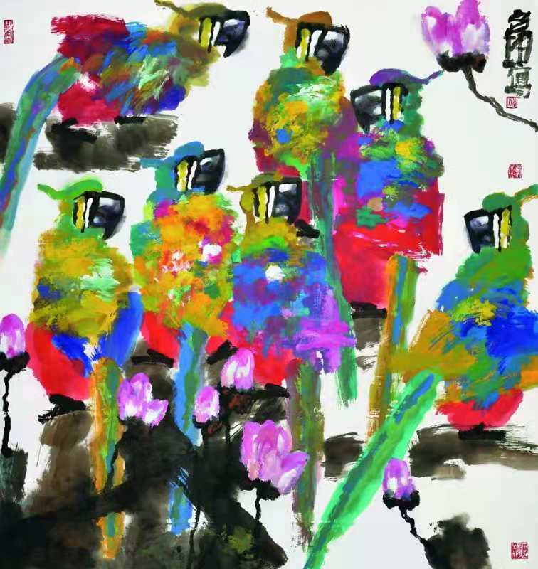 进入展厅,层高15米,面积12000余平方米的空间里,大画幅作品依次悬挂,带来强烈的视觉冲击。展览开篇处,93岁中国著名美术评论家、著名画家鲁慕迅为展览专程题字“大手笔,大气象。胸中有五岳四海 ,笔底见万里风云”,高度概括了蔡寅坤艺术的特点。仔细观摩,会发现此次展览全面梳理了蔡寅坤从艺以来的艺术经历和心路历程,以对比交错的方式,展出了蔡寅坤近年来创作的新作和从艺之初的艺术探索。其中,《高歌入云霄》《葵花朵朵向阳开》《喊荷》等作品展现当今的和谐幸福生活,表达了对建党100年的祝福。而临恩师赵蕴玉先生的墨荷等作品,则是向观众展现了蔡寅坤水墨荷花技法的成熟与转变。