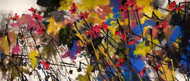 展厅内,高五米,宽十二米的巨幅大写意作品《喊荷》颇为引人注意,色彩跃动间,蔡寅坤把荷之韵展现地淋漓尽致。“此作品名字中之所以有个‘喊’字,是表达了一种内心喜悦的呼喊,一种对和谐幸福、美好生活的表达。”蔡寅坤擅画荷,在他的笔下,多描绘着秋天的荷塘景色。在蔡寅坤看来,秋天有着欣欣向荣的景象,象征着成熟,代表着收获,也正因此,秋天的荷花更有韵味。
