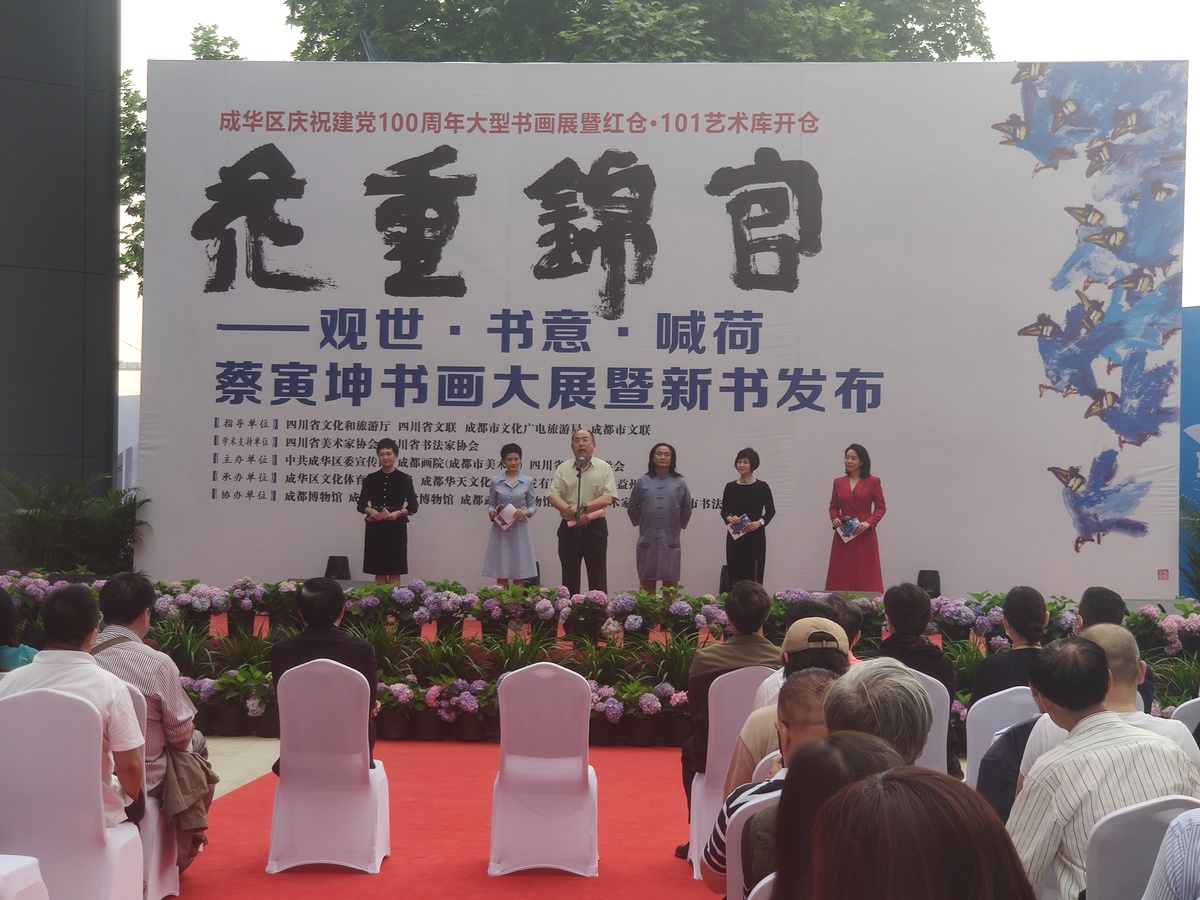 5月21日,成都市成华区庆祝建党100周年大型书画展暨红仓•101艺术库开仓《花重锦官》一一观世.书意.喊荷蔡寅坤书画大展暨新书发布在成都红仓•101艺术馆开幕。展览展出大写意画家蔡寅坤从艺数十年来绘画、书法艺术精品近400幅,分别由魏学峰、谢春彦、康征三位知名艺术评论家担任展览学术主持。