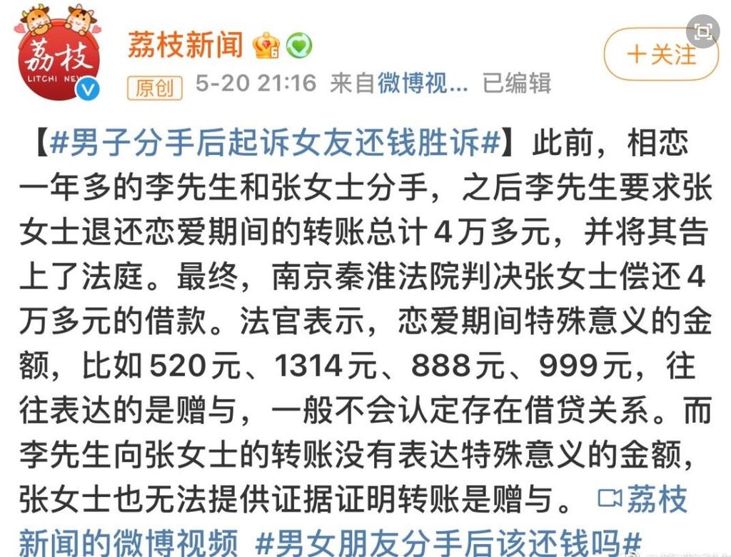 从网上热传的一张图片显示,男方律师提示:发520、1314等金额可能被认为具有特殊含义,属于赠予,分手时不能主张返还,请发1000等普通金额,可能被认定为借款。女方律师提示:收到整数红包时请记得回复"谢谢亲爱的,节日红包好喜欢"之类的话,锁定赠予属性。