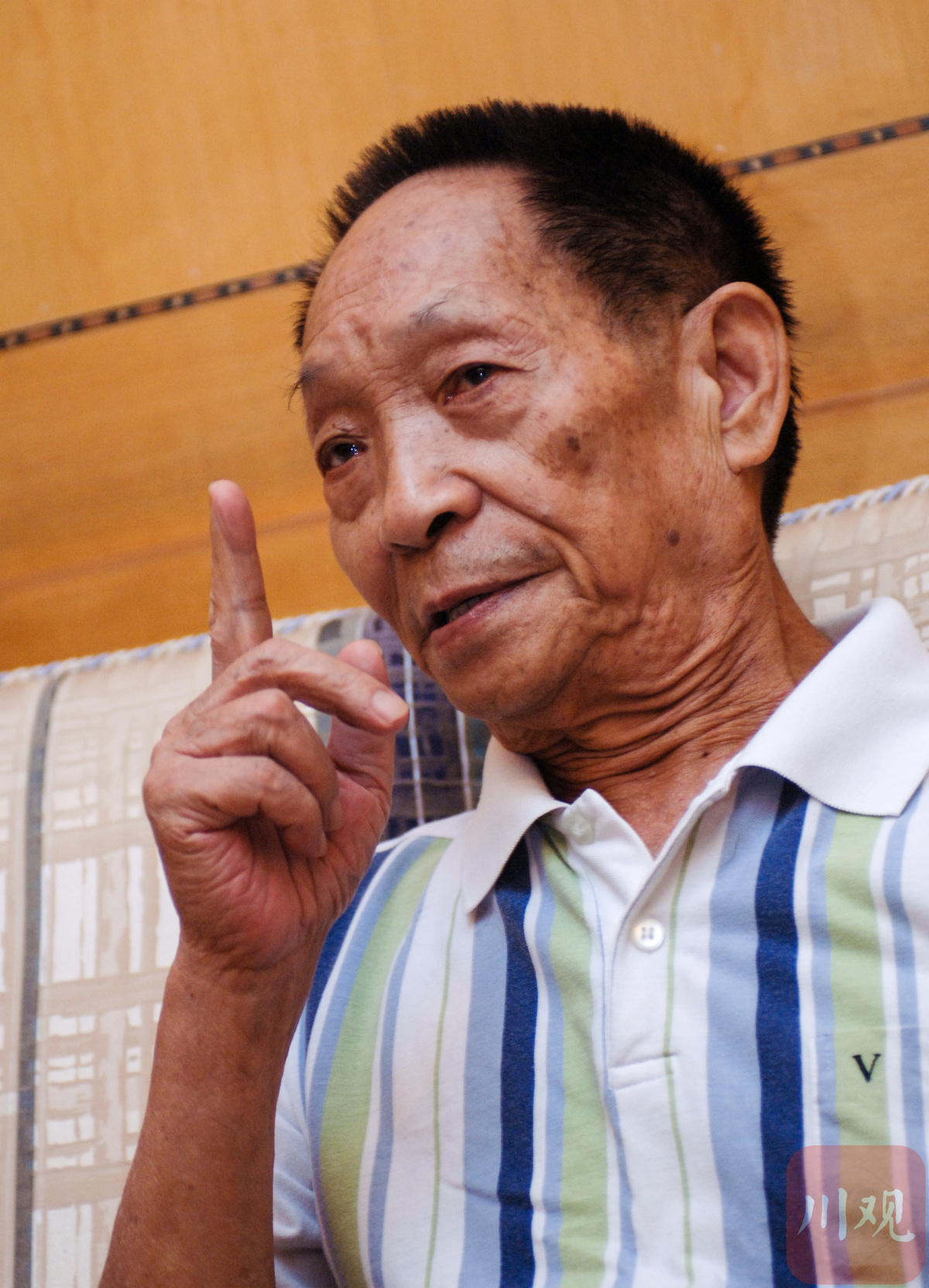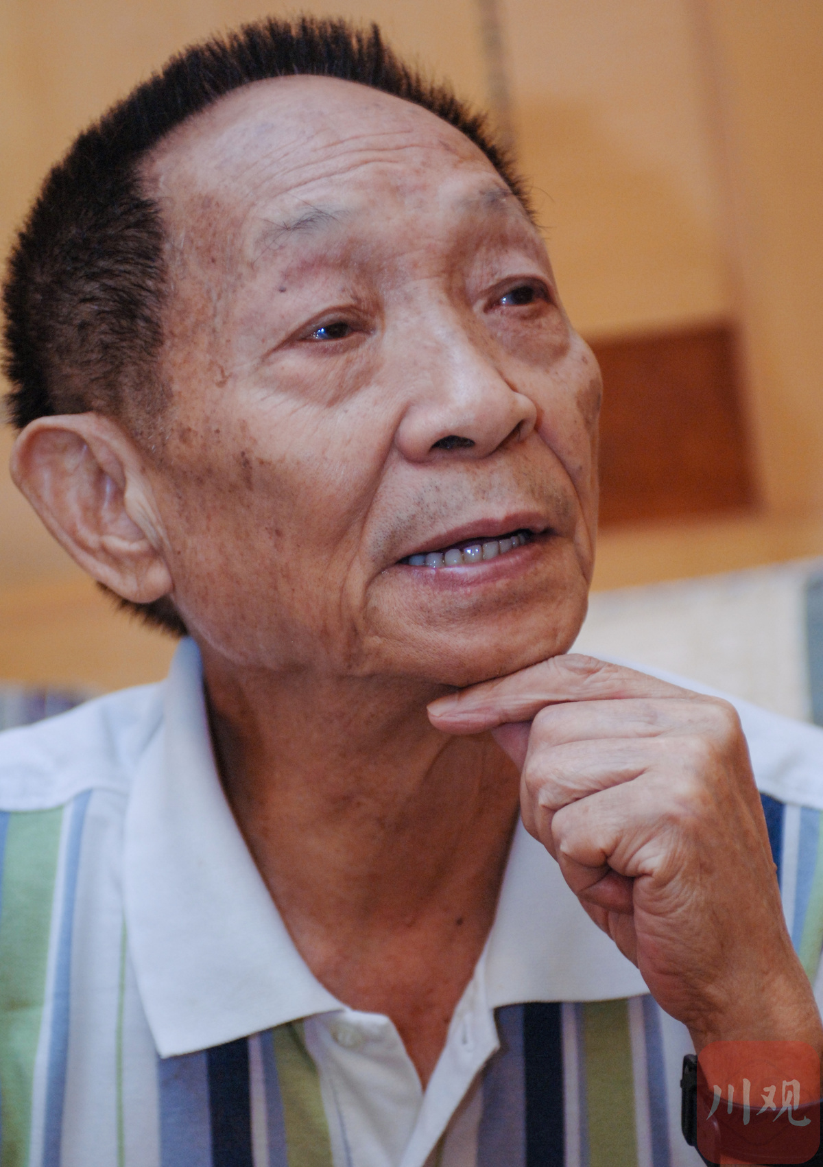 2006年8月20日晚,本报记者在成都一家宾馆偶遇袁隆平,冒昧登门拜访。打开房门,袁隆平黑瘦脸上带着微笑,身着一袭花格短T恤,精神依然是那么抖擞,忙碌一天的他欣然接受我们的采访,一进房间,记者一眼就看到放在茶几上的一穗金色饱满的稻穗。中国工程院院士、著名的“杂交水稻之父”袁隆平向记者讲述在位于郫县犀浦镇石亭村的国家杂交水稻工程技术研究中心成都分中心的超级稻试验田考察,他一路细细地看,一路细细地听,看到田里的水稻垂着金黄硕壮的稻穗,袁隆平兴奋地告诉记者:“这些水稻颗粒饱满长势非常好,能够达到亩产800公斤的水平”。袁隆平这次来成都,是为实现他提出的“种三产四”丰产工程构想而来———种3亩超级稻,产出4亩的产量。 “看到的现场使我非常高兴,至少我们的"种三产四"计划在成都平原是可行的。”袁隆平说。