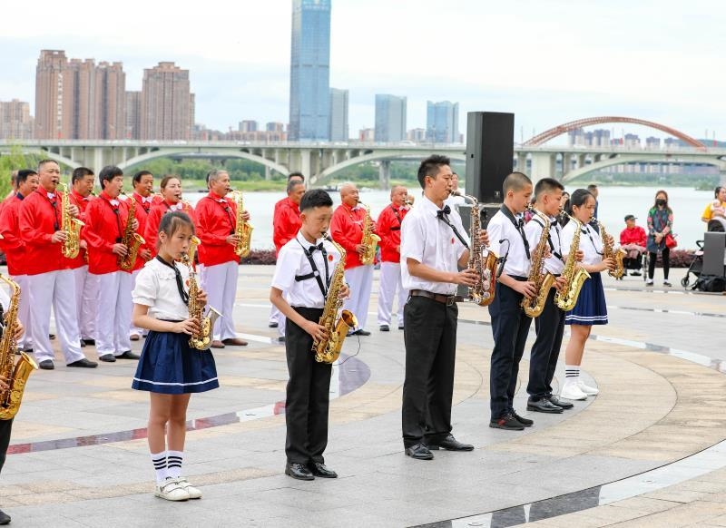 “唱支山歌给党听,我把党来比母亲……”“快闪”活动在《唱支山歌给党听》的萨克斯演奏中拉开帷幕,随后身着红、黄党旗底色,胸挂萨克斯、手持竹笛的参演艺术家,从四面八方走来,脸上洋溢着喜悦之情,竹笛领奏、萨克斯合奏……一时间现场声乐齐鸣,气势宏大。