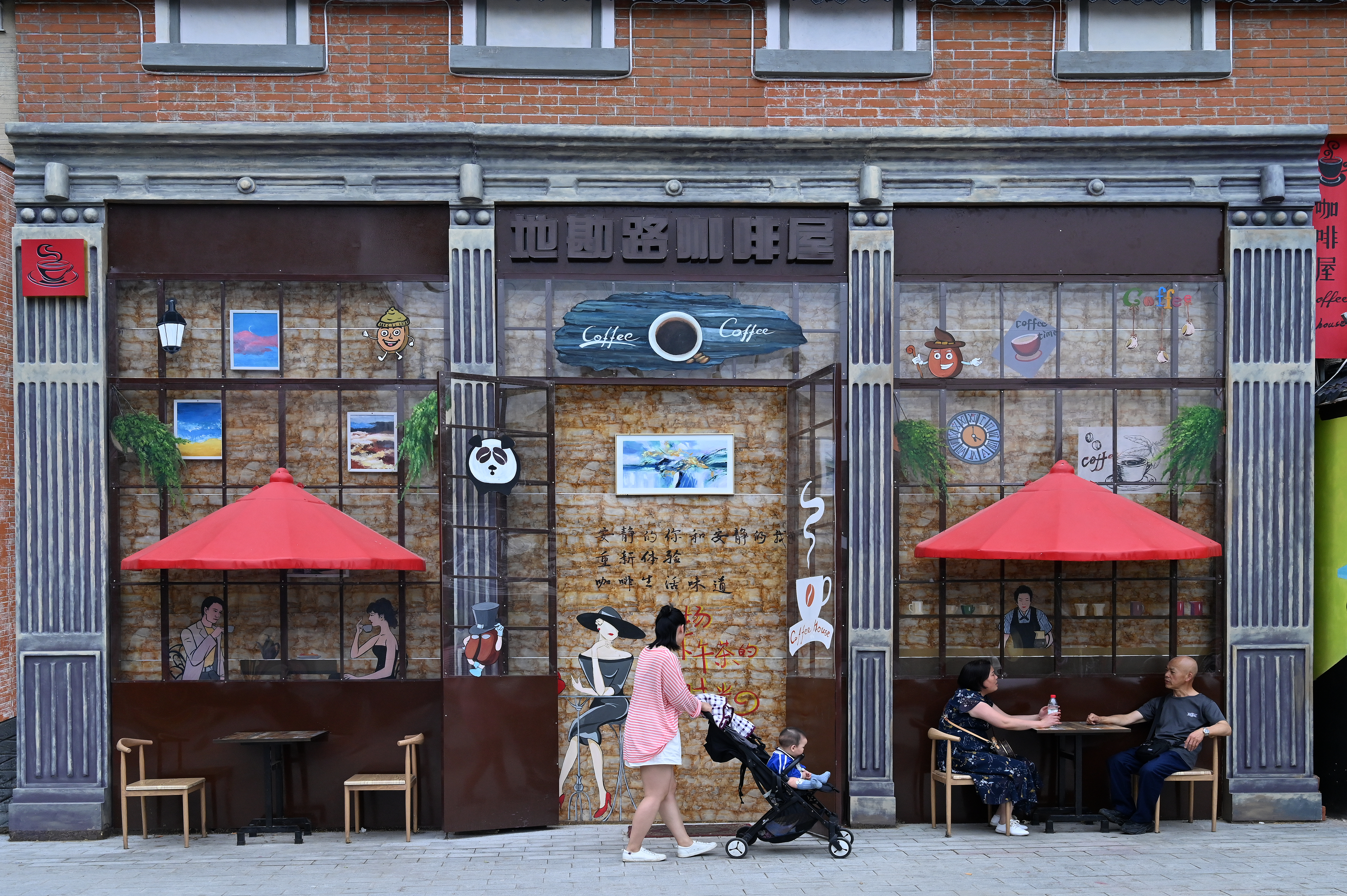 5月21日,成都地勘路咖啡一条街,在装饰一新的街道旁小憩的市民。