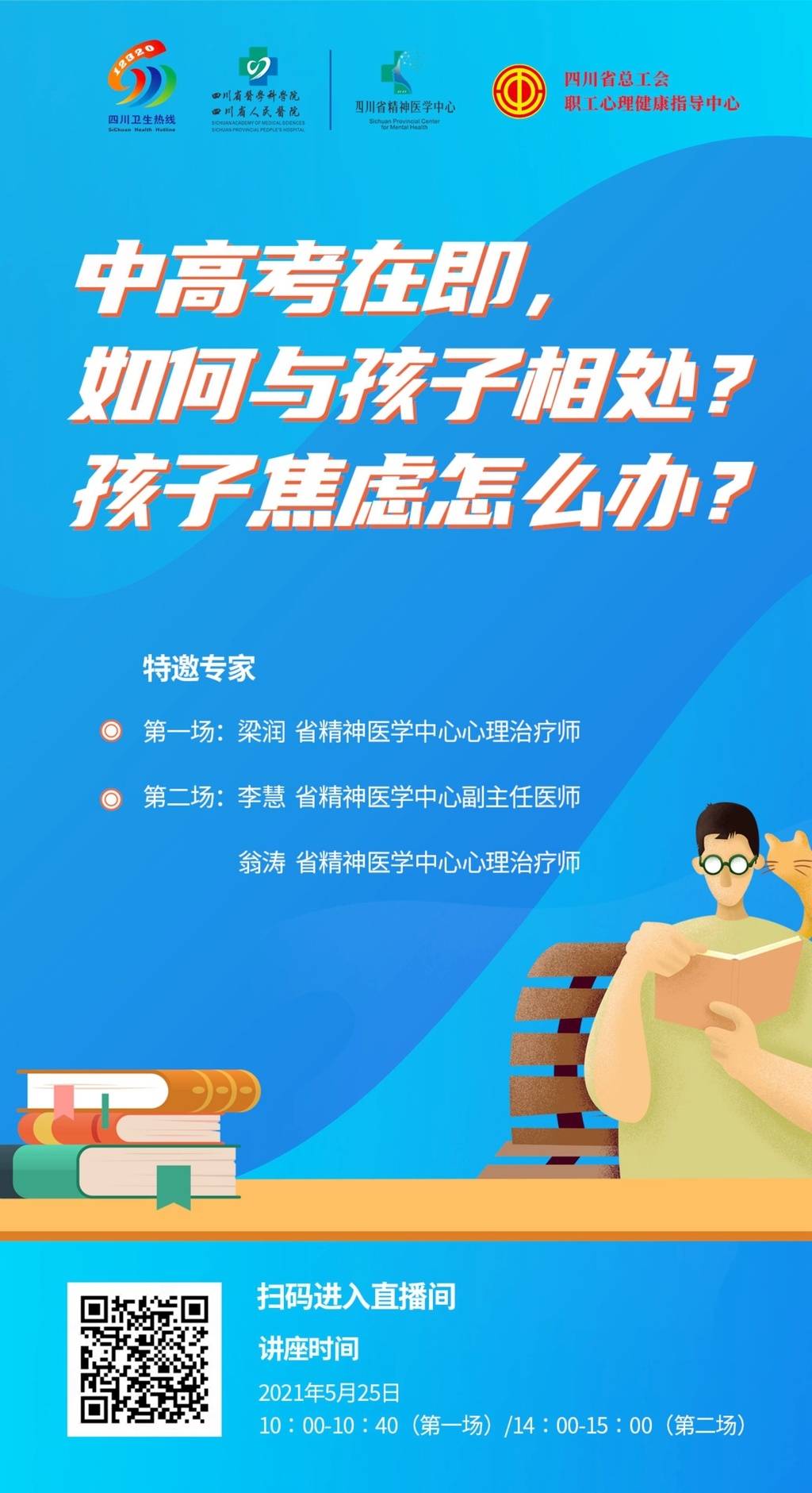 5月24日记者从省总工会获悉,5月25日,省总工会职工心理健康指导中心联合12320四川卫生热线、省人民医院和省精神医学中心,将举办2场中高考期间职工家庭心理辅导专题直播讲座。