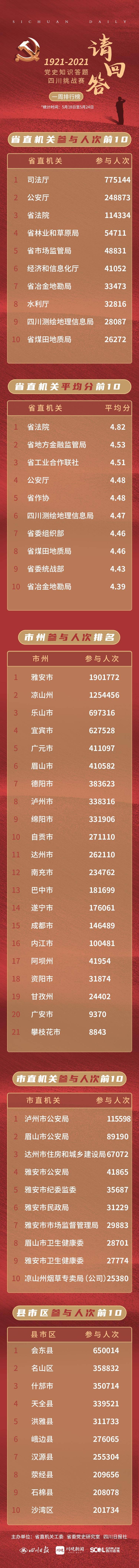 根据最新数据显示,省直机关参与人次排名中,省司法厅以775144人次参与继续高居榜首,省公安厅、省法院位列二、三名。从市(州)来看,参与人次前3位的依然是雅安市、凉山州和乐山市,值得一提的是,广元市从上周第8名冲至第5名,上升趋势明显。从区县来看,参与人次排名前三位的分别是会东县 、名山区和什邡市。
