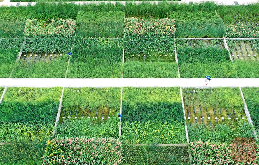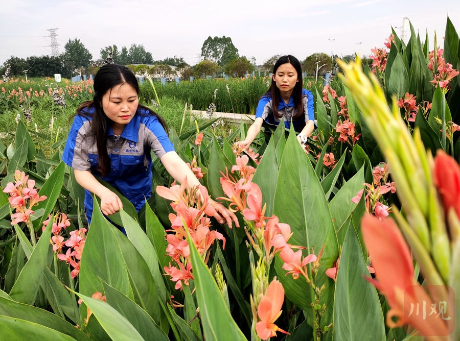 仁寿县生活污水处理厂的配套生态湿地里,工作人员正在维护水生植物。