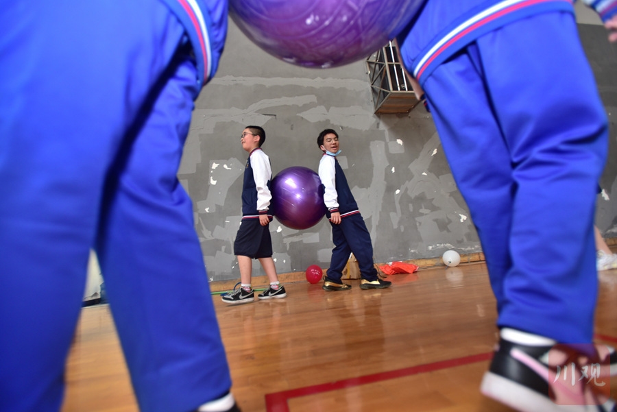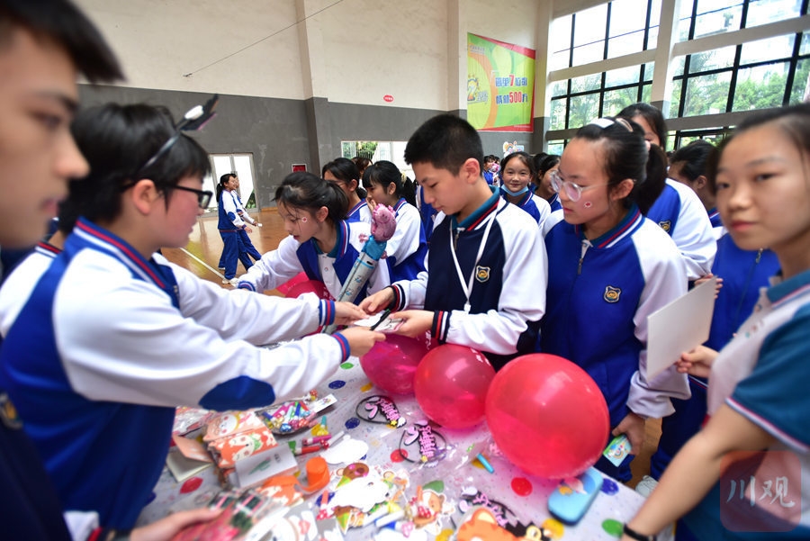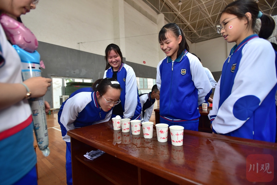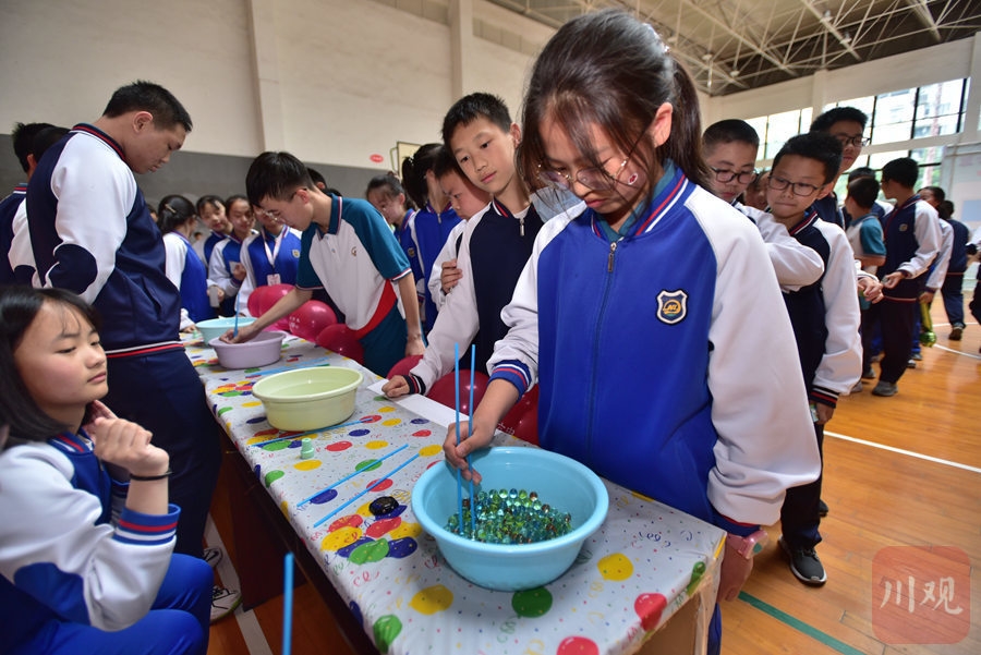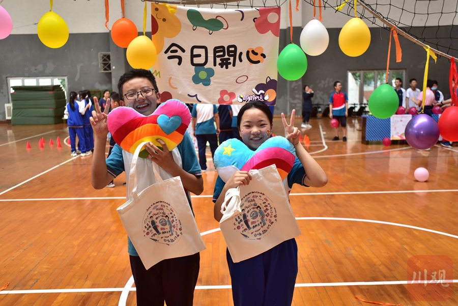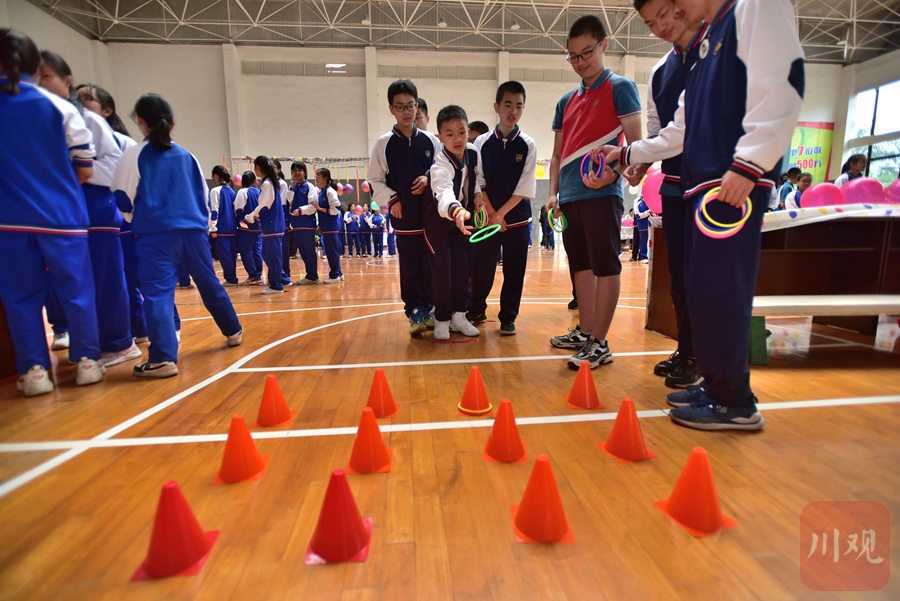 内江市第六中学的学生在心理游园会上参与趣味游戏。