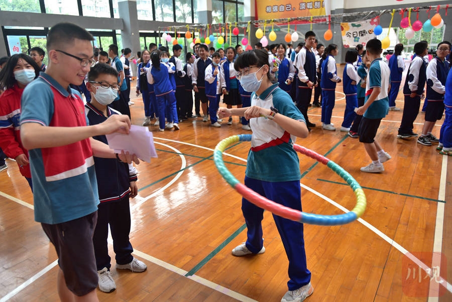 2021年5月24日,四川省内江市第六中学的学生在心理游园会上参与趣味游戏。