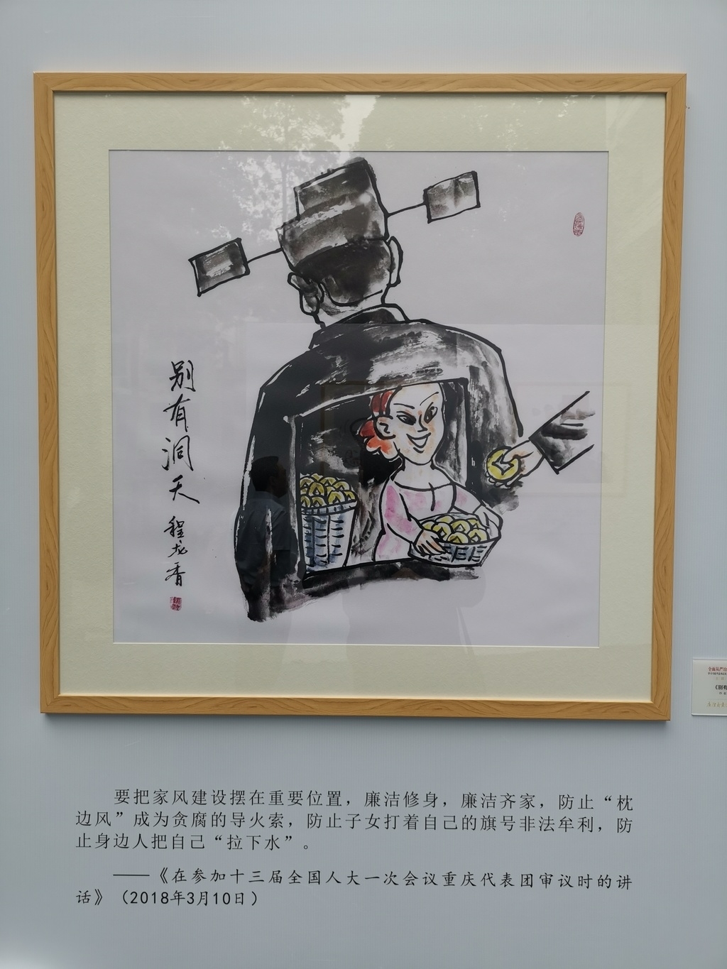 一人伸手穿过两条高压线,欲去摘头顶的苹果,结果触电。两条高压线旁,分别注明"党纪”、"国法”......5月25日,由自贡市纪委监委组织荣县农民漫画家精心创作的68幅漫画在自贡展出,用直观、幽默的形式,生动诠释全面从严治党的重要性和必要性。