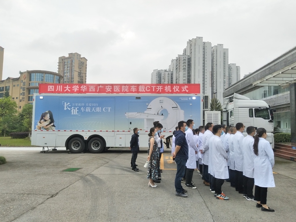 近日,广安市民陈仁身着病服躺在一台CT机(即计算机X线断层摄影机)上,医生在另一侧检查所形成的图像。值得注意的是,这台机器以及整个操作过程都是在一辆车上进行的。原来此设备是四川大学华西广安医院(广安市人民医院)最新引进的“‘长征’车载天眼CT”,这也是川东北地区首台半挂式车载CT,它将为广安市在疫情期间增强防控和筛查能力提供极大便利。