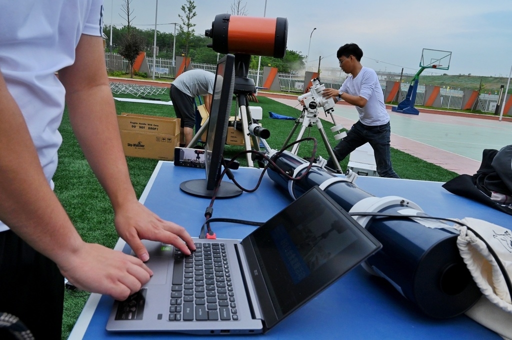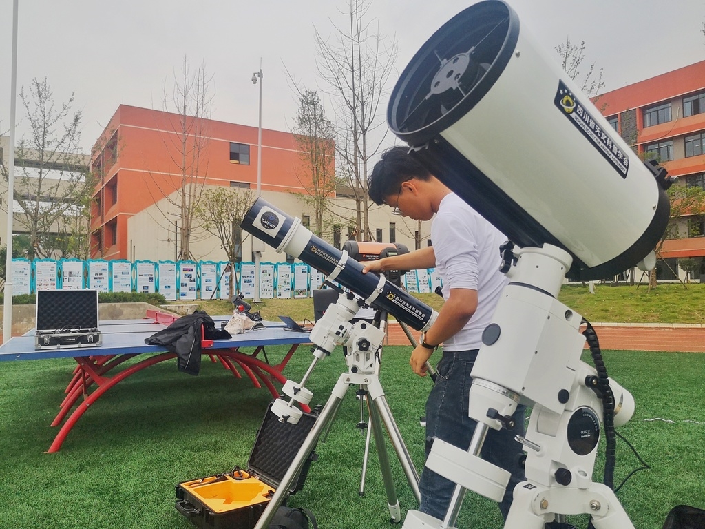 5月25日,四川省天文科普学会的成员们在成都大学附属小学布置、调试观测天象奇观的设备。