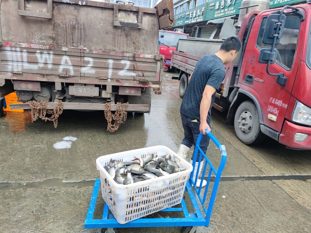 鲫鱼、草鱼、鲤鱼、花鲢……一筐筐活鱼被从车上运下,放进各销售商的鱼池里。“鲫鱼十四块八一斤,不零卖。”听到记者询问价格,东方希望金豆水产的老板快速回了一句话,就忙着跟鱼罐车运输员核对鱼的重量去了。