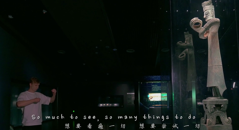 视频开头,初到三星堆博物馆的菲利普满怀疑惑,亲身走进三星堆后,他的表情也由“?”转变为“!”,正如他在MV中所唱“徜徉青铜时代,已然心醉神迷。”
