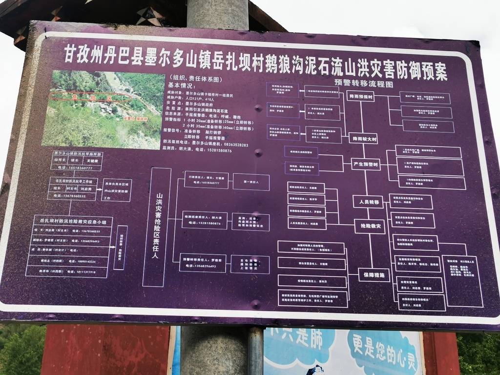 目前,丹巴建立起县、乡(镇)、村、组、户五级网络,全县918处地质灾害监测点都设立警示牌,并在每处地质灾害监测点安排1—2名监测员,切实做好监测预警工作,努力把地质灾害可能造成的损失降到最低。其中,墨尔多山镇共计有隐患点133个,监测人员154名,为确保安全度汛,要求所有监测人员必须做到,雨前检查雨中巡查,雨后排查,确保人民群众的生命财产安全,同时也确保监测人员的自身安全。