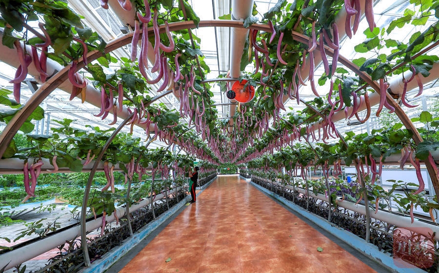 泸州市江阳区董允坝现代农业园区内,众多游人在观赏大棚内的“智慧”蔬菜。