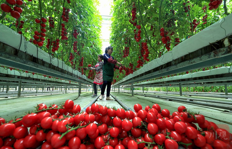 2021年5月27日,在泸州市江阳区董允坝现代农业园区内,村民在采摘西红柿。