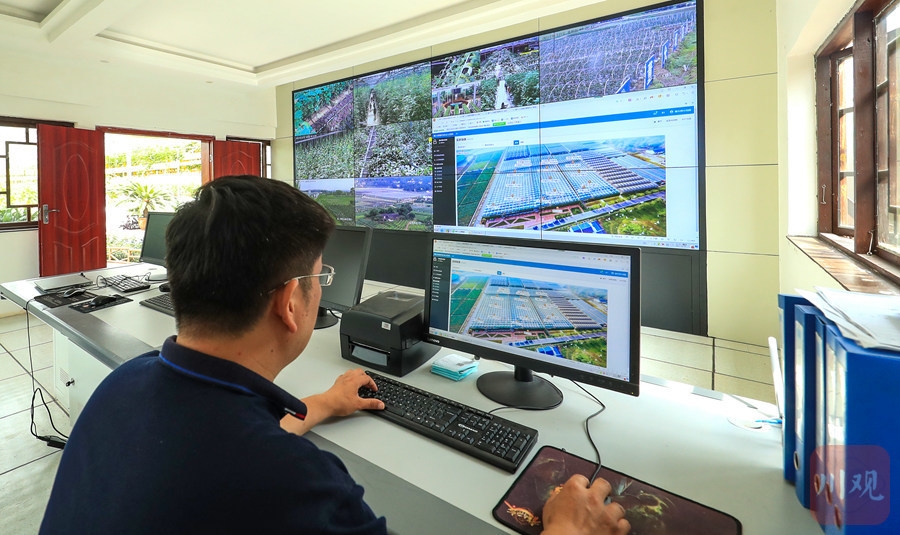 泸州市江阳区董允坝现代农业园区内,技术人员在中控室里远程诊断蔬菜的生长情况。