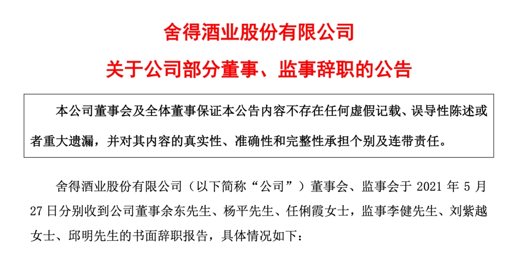 舍得酒业发布《关于公司部分董事、监事辞职的公告》称,2021 年 5 月 27 日分别收到公司董事余东先生、杨平先生、任俐霞女士,监事李健先生、刘紫越女士、邱明先生的书面辞职报告。