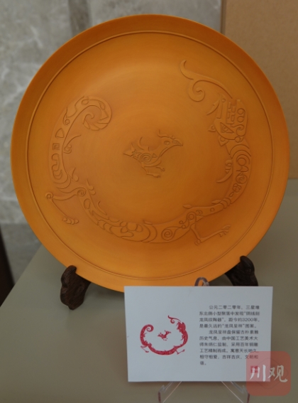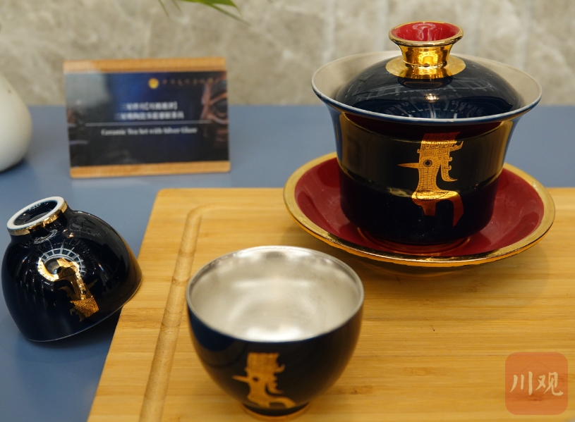 古蜀先民一直在追求突破,三星堆文创人也将触角大胆伸向全新领域:非遗文化。“非遗承载的文化信息和美学价值又高一个水平,市场售价和接受人群完全不同,但值得一试。结果看来,二者结合堪称默契。”钟科进介绍,以国家级非遗朱炳仁铜盘为例,其大婚系列的“龙凤呈祥”盘是一款传承悠久的经典产品。2020年,三星堆东北侧小型聚落发现一件阴线刻的龙凤纹陶器,可以说是最久远的“龙凤呈祥”图案。文创团队由此产生灵感,以三星堆这个龙凤纹为原本,创作了一款铜摆盘,龙的形象非常接近青铜神树上那支攀爬的游龙,凤的造型也是典型的三星堆青铜鸟风格。铜盘采用百年铜雕工艺,手指叩之有清脆悦耳的声音,寓意则更是吉庆祥和,只限量做了200件,且每只盘的背后都有编号。