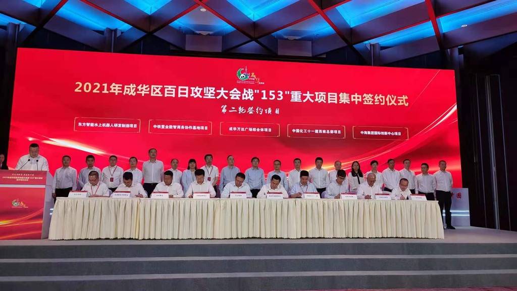 5月28日,2021年成都市成华区百日攻坚大会战“153”重大项目集中签约仪式在成都举行。现场集中签约PANDA·国际演艺文商旅综合项目、华润集团5G智慧产业园、四川文化产业投资基金等15个重大项目,涉及智能制造、音乐文创、新兴金融等领域,总投资达767亿元。同时,成华区选聘了十一科技设计院院长赵振元、仲量联行大中华区执行董事乔裕生等60名知名企业家、商协会代表成为首批“招商特别顾问”,并现场为16名“招商特别顾问”代表颁发了证书。