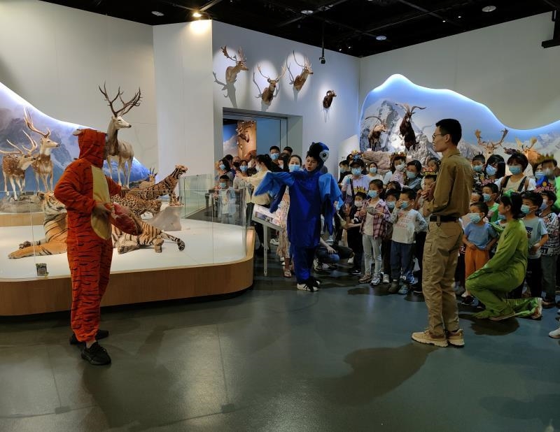 当晚,根据常设展“人与自然:贝林捐赠展”原创开发的沉浸式参观体验“奇幻森林环游记”首次亮相。这是一场孩子们可以边看边参与边思考、全感官体验的沉浸式参观活动。展厅里,讲解员们化身蝴蝶、狮子、河马、老虎、猴子、小青蛙等角色,通过故事演绎、场景表演、现场互动等多种形式,让孩子们经历一次“奇妙动物王国穿越之旅”,在活动中培养孩子们热爱自然,保护环境的意识。