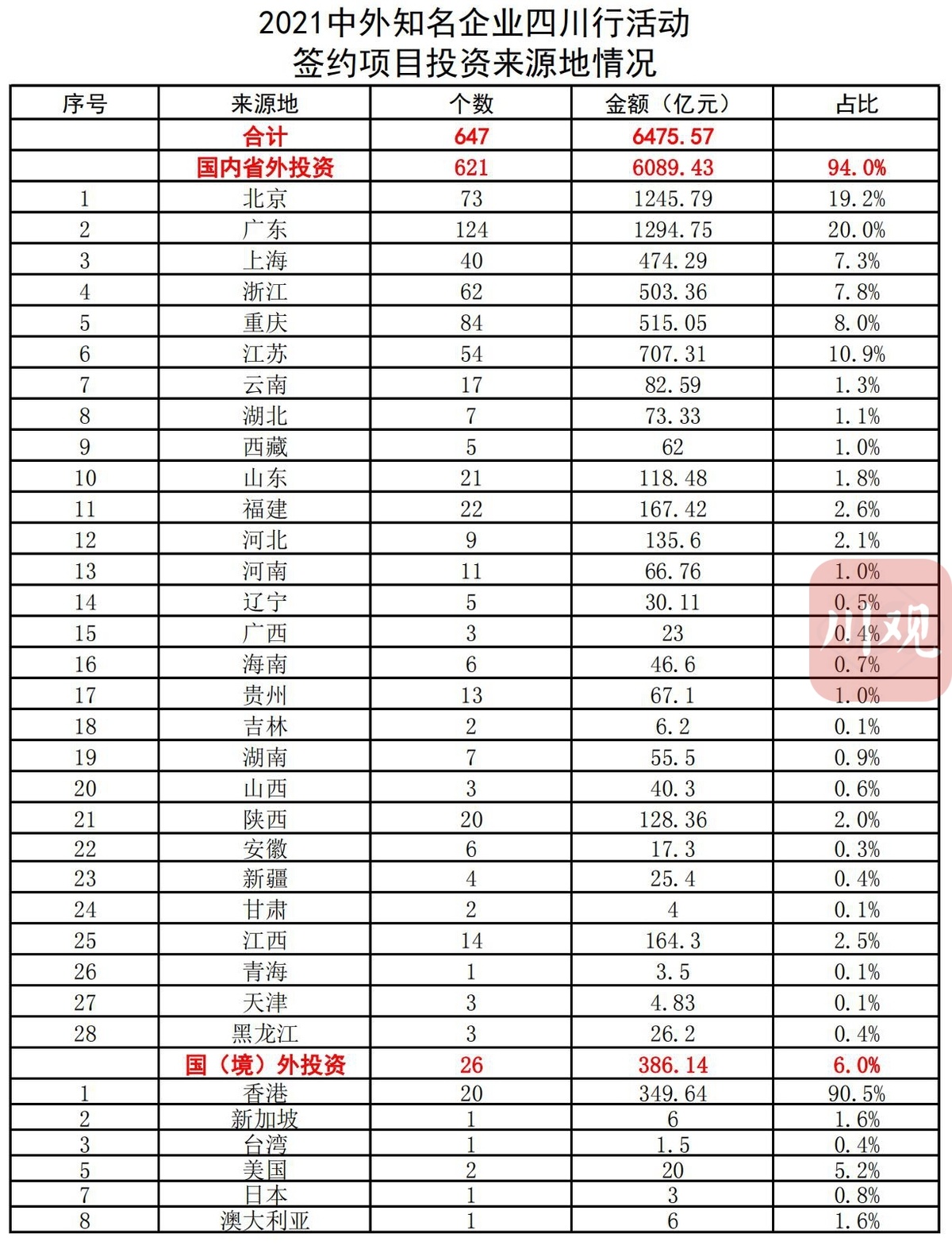 5月29日上午10点,2021中外知名企业四川行(以下简称四川行)主体活动——投资推介会暨项目合作签署仪式在成都举办。据四川省经济合作局统计,本次2021中外知名企业四川行活动期间,共有647个招商引资项目签约,签约金额6475.57亿元。