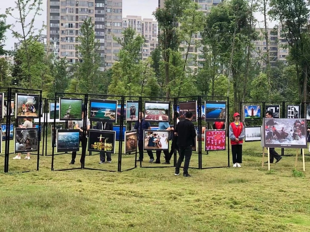 在武胜黄林溪公园内的一处草坪上,“永远跟党走、党的光辉历程”的标语颇为醒目。往里看去,上百朵红色、黄色的鲜花拼成“100”的字样。在这片草坪上,展出了五百多幅字画、照片与剪纸作品。