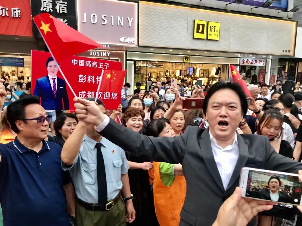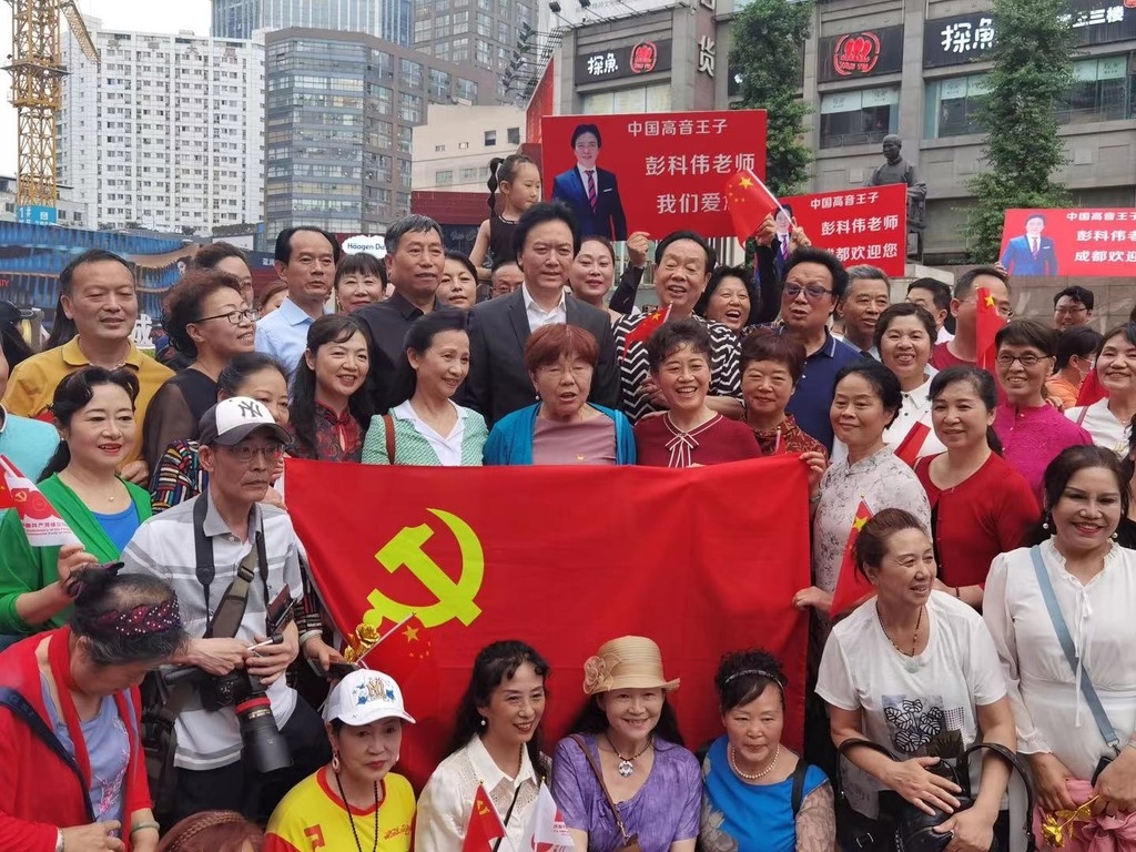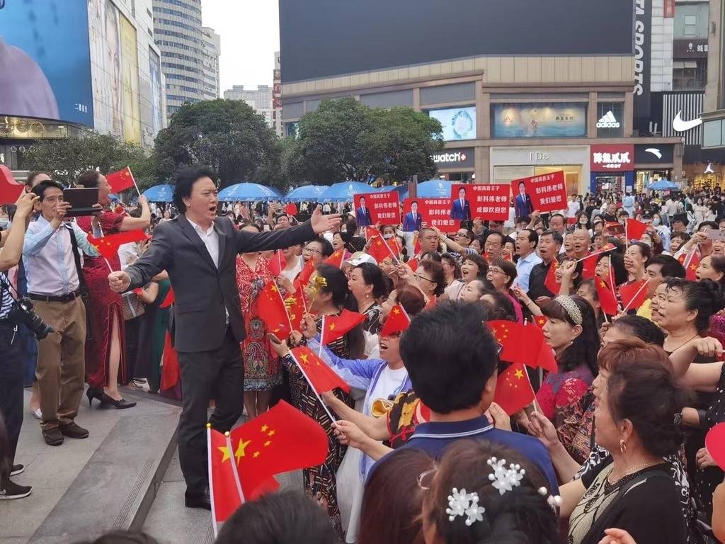 29日傍晚,四川省文化院团联合会志愿者分会在春熙路中山铜像广场举行庆祝建党百周年快闪活动,特别邀请到中国高音王子、四川巴洛克歌剧院院长、著名歌唱家彭科伟助阵。快闪现场红旗飘扬,歌声嘹亮,许多群众自发地从四面八方加入快闪队伍,成百上千的追星族也前来共同庆祝迎接我们党生日的到来。