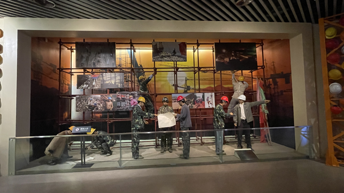 在离橱窗不远的地方,纪念馆用雕塑的形式搭建了一幅灾后重建的场景,生动还原了地震重创后,重建家园的激情岁月。王华蓉告诉记者,“在灾后重建的过程中,来自全国各地的援建者们扎根灾区,一干就是两三年。这组雕塑,选择了山东援建者崔学选、苏州援建者沈国芳和广东援建者邱衍庆进行再现。”