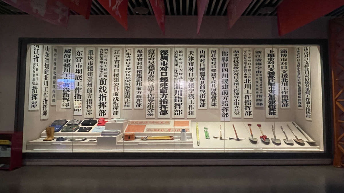 在5·12汶川特大地震纪念馆二楼的展厅里,有一个挂满各地对口援建工作指挥部牌子的橱窗,里面“山东省援建北川工作指挥部”的牌子格外引人注目。在灾后重建的日子里,山东援建队的队员们曾经奋战在北川的土地上,从资金、技术、人员等多方面支援北川的灾后重建。牌子前摆放着的土铲上还留有北川新县城的泥土,援建队的安全帽上也充满了划痕。