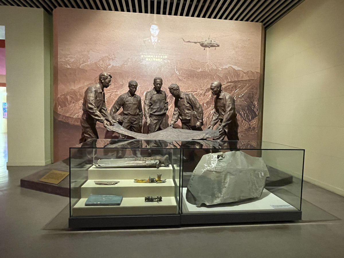 在雕塑前方,陈列着部分直升机残骸,无声地诉说着抗震救灾奇迹背后令人悲痛的一面。“邱光华是阿坝州茂县人,他的家乡也是汶川地震的重灾区。在17天的救灾飞行中,邱光华频繁执行汶川、北川、茂县等重灾区的飞行任务,先后飞行63架次,运送救灾物资25.8吨,输送救灾人员87人,转移受灾群众234人,为抗震救灾作出了突出贡献。”