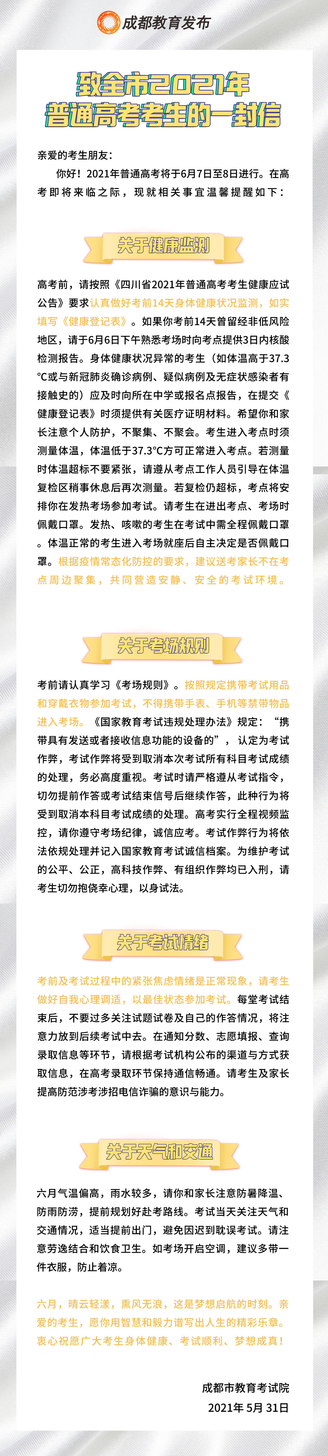 2021年6月7日、8日,高考即将拉开帷幕。5月31日,成都市教育考试院给全市学生发出一封信,提醒考生6月6日下午熟悉考场,并向考点提供3日内核酸检测报告。体温低于37.3°才可以进入考点。