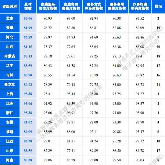 评估结果显示,在省级政府一体化政务服务能力总体指数排名中,上海、浙江、广东并列第一,四川位列第五。北京、上海、江苏、浙江、安徽、广东、四川、贵州8个省级政府的一体化政务服务能力总体指数超过90,被评为“非常高”。在重点城市一体化政务服务能力总体指数排名中,深圳位列第一,成都与福州并列第八。