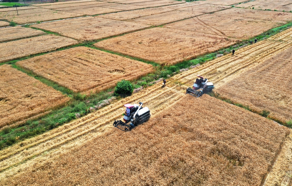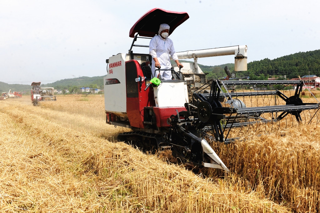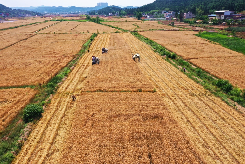 5月31日,在德阳市中江县永太镇中化现代农业园里,金黄的麦浪在阳光下摇曳生辉,麦香扑鼻而来。一台台收割机穿梭在金色的麦田里,一辆辆运粮车奔驰在作业道上,一派丰收的景象。